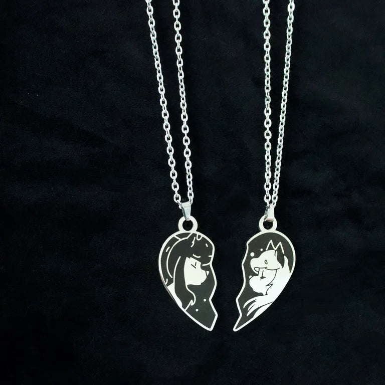 A set of two stainless steel necklaces. The design is etched in a matte black.