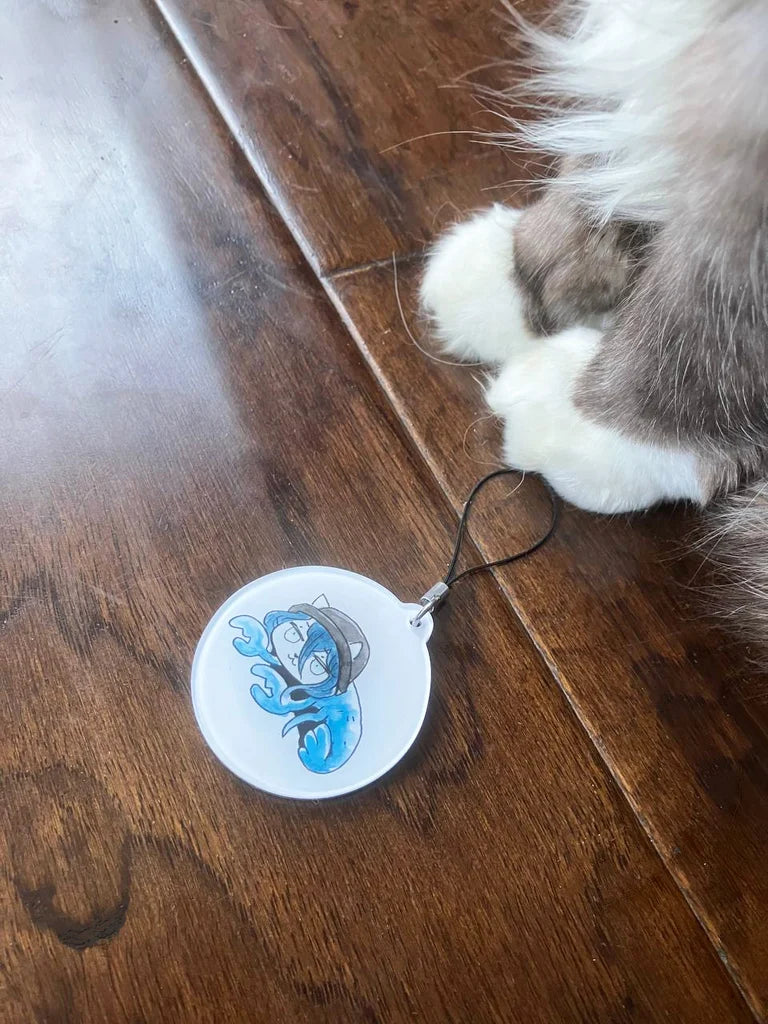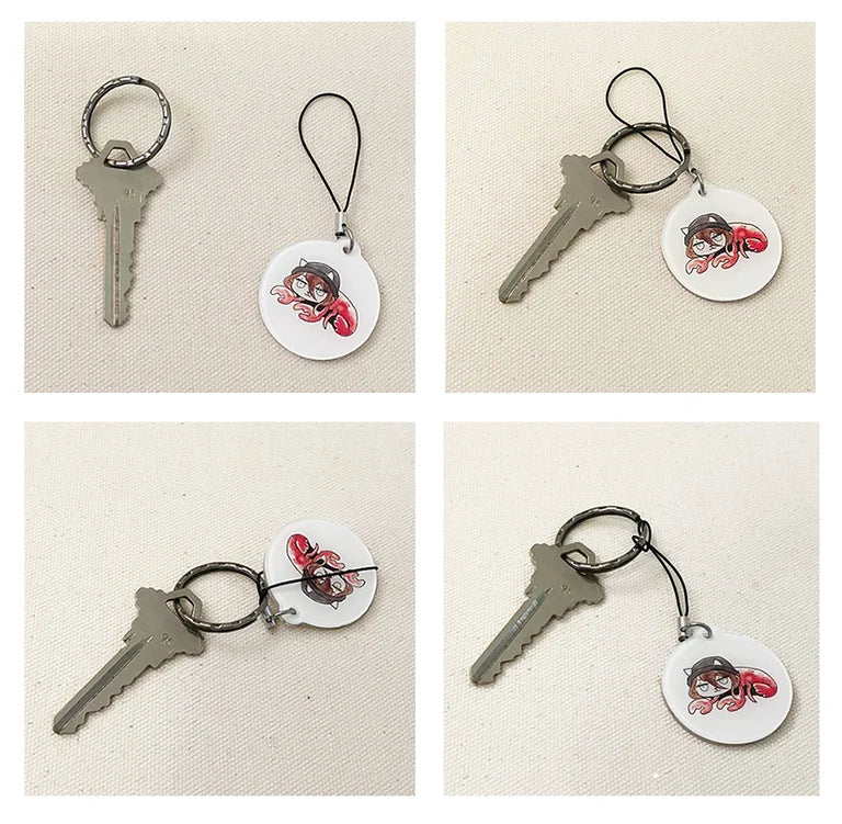Take the string end and loop it through your keys / phone case. Open the loop, and put the plastic part through it. Pull it taut, and enjoy your beautiful keyring!